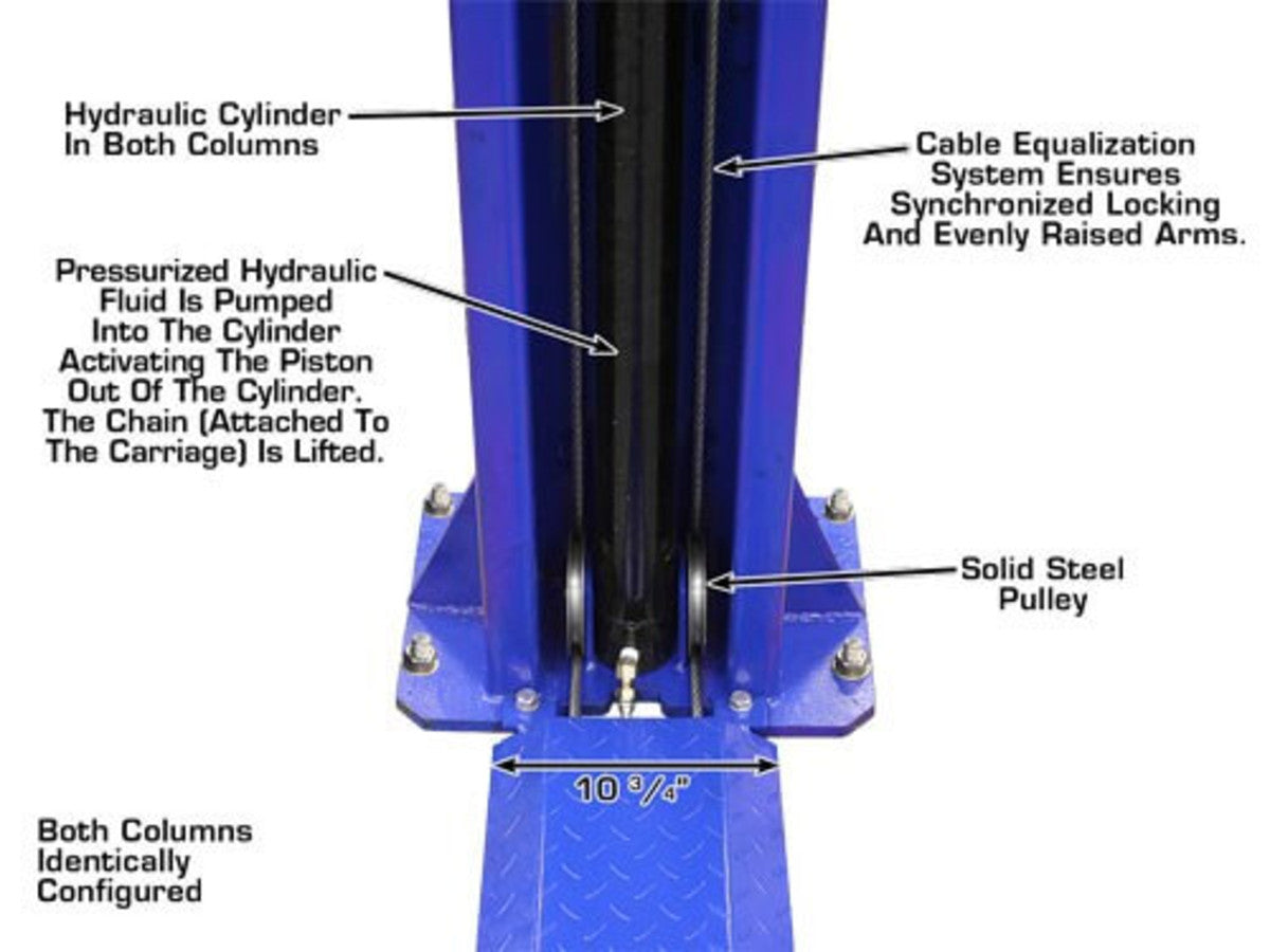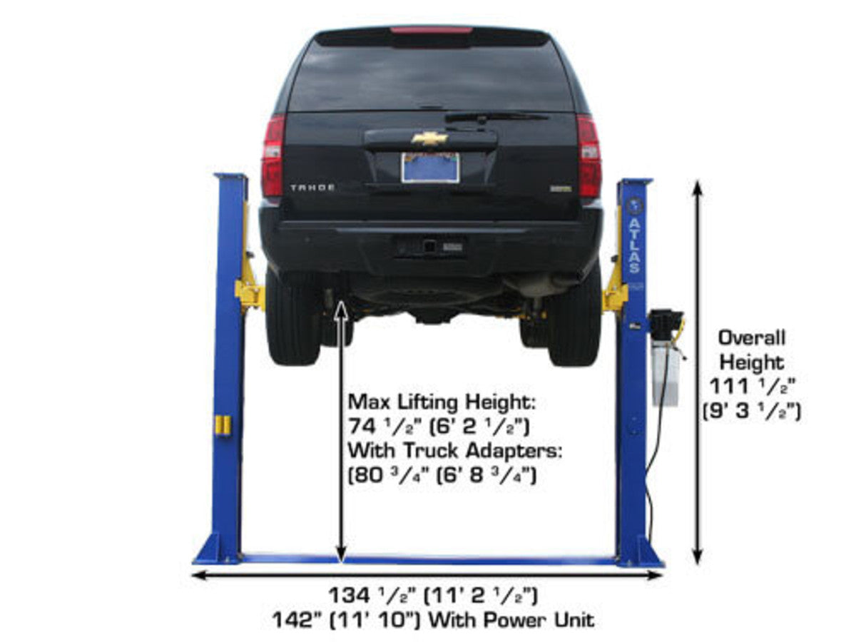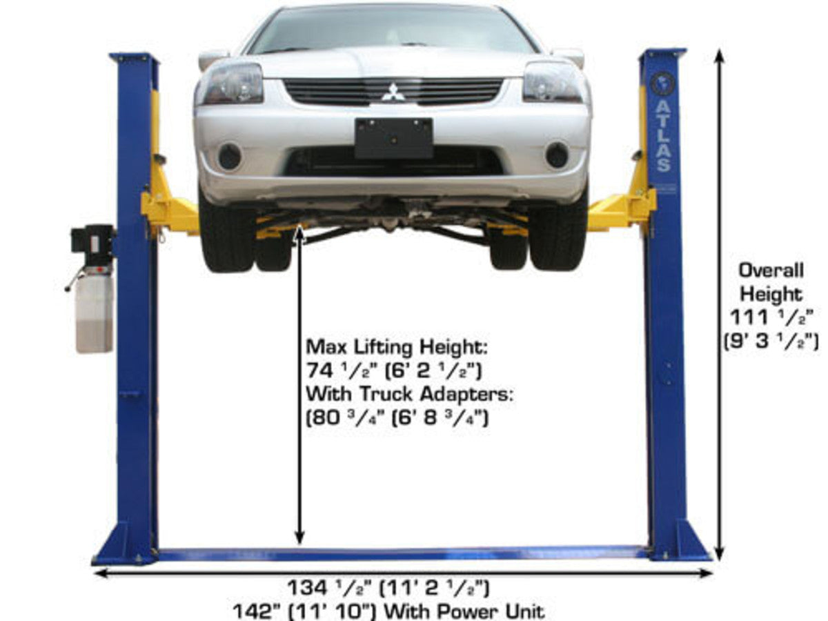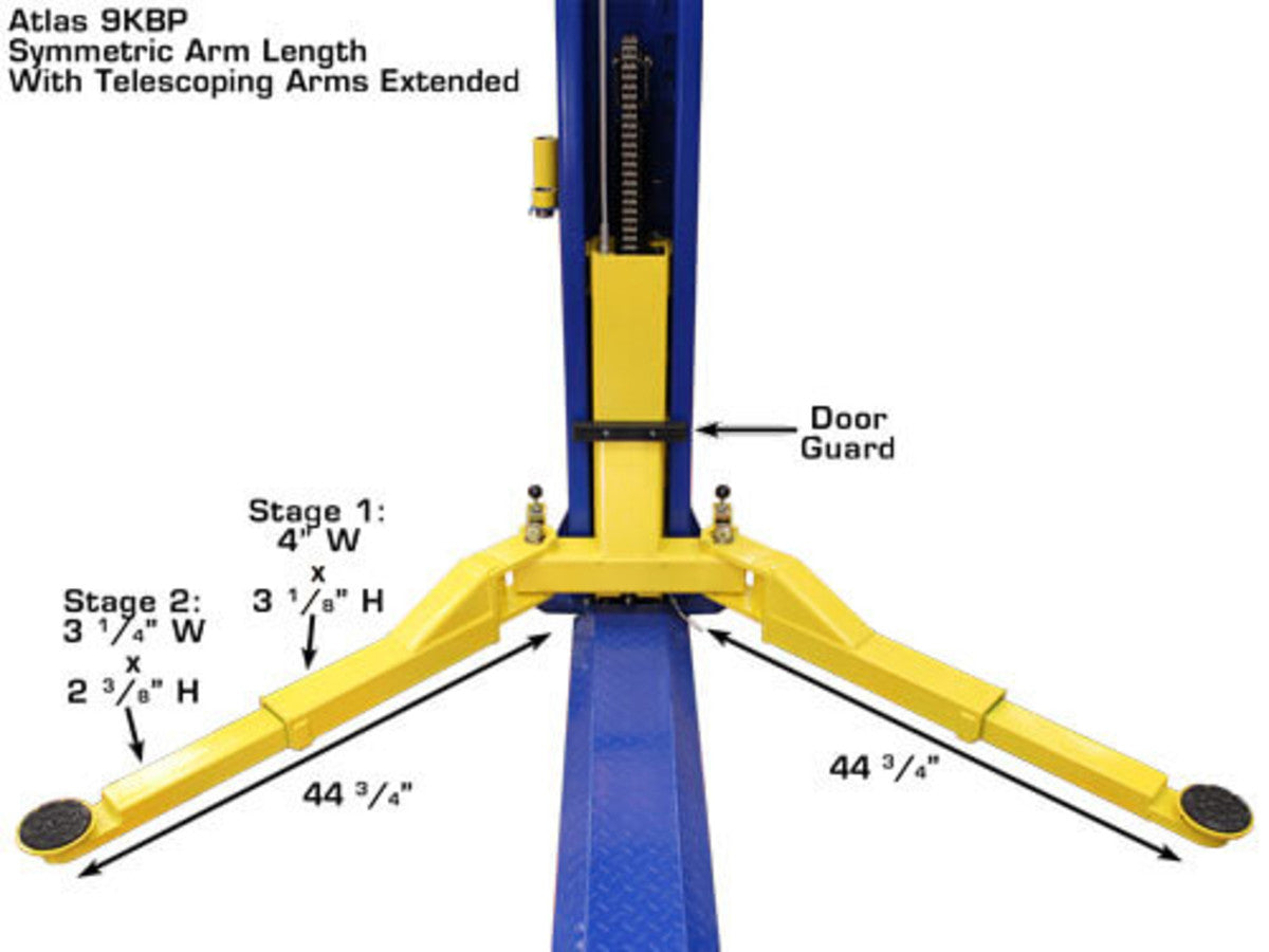 The Atlas® 9KBPX is an economically designed baseplate two-post lift great for low ceiling garages. The total column height of 111” (9 feet 3 inches) allows this lift to be installed in almost any professional or home garage with a ceiling as low as 9 feet 6 inches. The Atlas® 9KBPX “chain over roller” lift features a spring loaded Secondary Lock System (SLS) that automatically engages in the event of a slack or broken chain. The reliable dual chain-drive cylinders, symmetric arms, and automatic arm restraints make this the perfect choice for “Mr. Homeowner” or small commercial shop looking to service cars, SUV's and light duty trucks (not recommended to lift Diesel Dually or other large truck