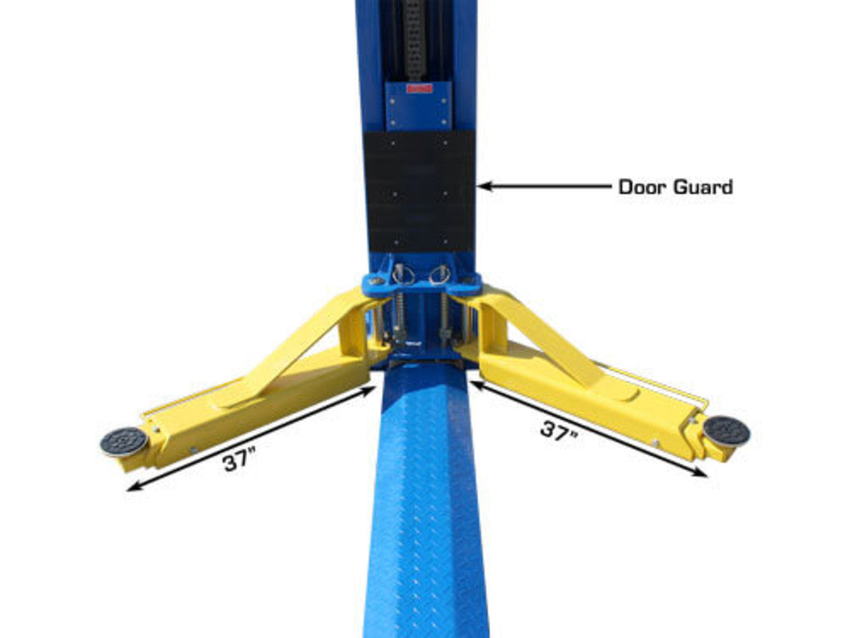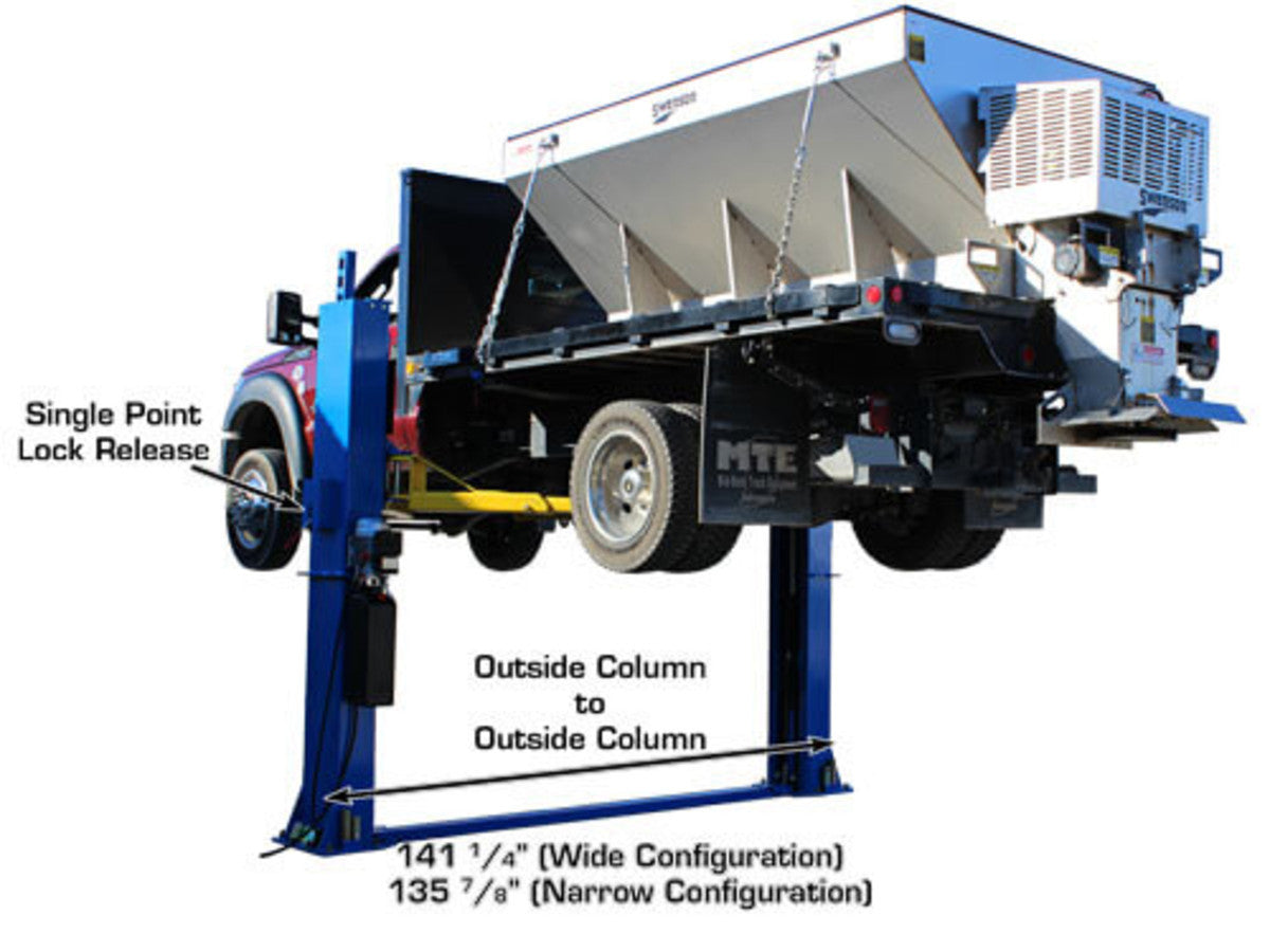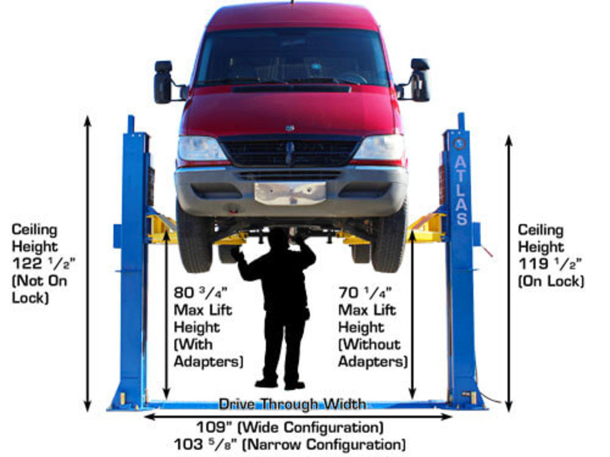The Atlas BP12000X is a commercial grade heavy duty 12,000 LB. capacity 2 post base plate above ground lift. This above ground lift has over sized columns, symmetric three stage arms, and single point lock release. This lift is perfect for those commercial garages that want to lift heavier vehicles but have limited ceiling height. The Atlas BP12000X can be installed at two different width settings to accommodate wider trucks or trailers and to facilitate “driving between” the lift columns.