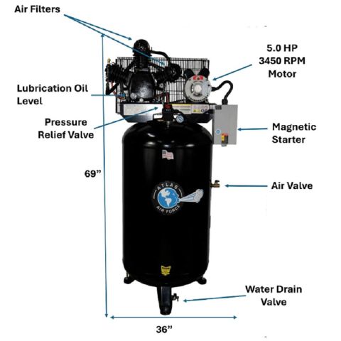 The Atlas Air Force AF7 is our entry level commercial grade two (2) stage vertical air compressor. This unit operates between 140 and 175 PSI. The combination of the commercial grade low RPM motor and the heavy duty 3cylinder (2 cylinders are low pressure and 1 cylinder is high pressure) cast ironreciprocating air compressor pump delivers an incredible amount of air volume and air pressure for a very low price. The AF7 comes standard with a USA made80 gallon steel tank and also includes a magnetic starter. The magnetic starter controls the electric input and adds to the longevity of the unit. The Atlas Air Force air compressors are powerful, belt driven reciprocating air compressors designed and built to offer years of trouble-free service. The Atlas Air Force shop compressors are built to the same exacting standards as the entire line of Atlas professional grade automotive equipment.