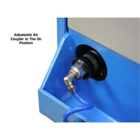 The separate control panel may be conveniently positioned to allow easy access for the operator. The 220-volt (single-phase) electric/hydraulic power unit is housed inside the metal control panel box. The push button controls activate the raising and lowering of the lift. The sophisticated air-actuated lock system is automatically engaged and disengaged as the lift is being raised or lowered. The lift has a safety lowering limit switch. Once the lift platforms are lowered to within 10 inches of the ground, the lift automatically stops its descent. The Down button needs to be released and depressed again to allow the lift to go down completely.
