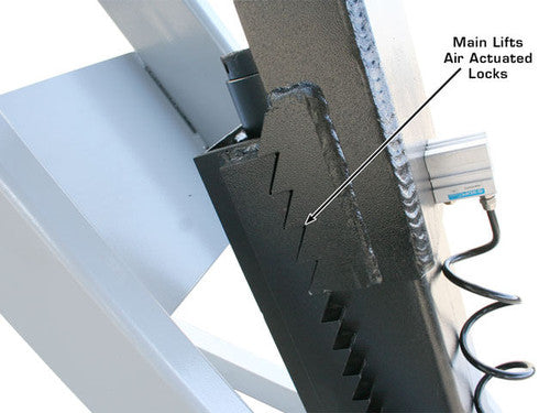 The separate control panel may be conveniently positioned to allow easy access for the operator. The 220-volt (single-phase) electric/hydraulic power unit is housed inside the metal control panel box. The push button controls activate the raising and lowering of the lift. The sophisticated air-actuated lock system is automatically engaged and disengaged as the lift is being raised or lowered. The lift has a safety lowering limit switch. Once the lift platforms are lowered to within 10 inches of the ground, the lift automatically stops its descent. The Down button needs to be released and depressed again to allow the lift to go down completely.