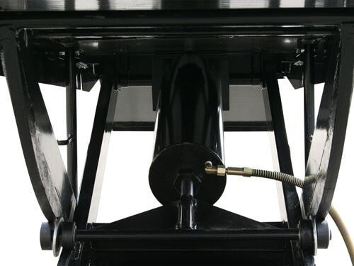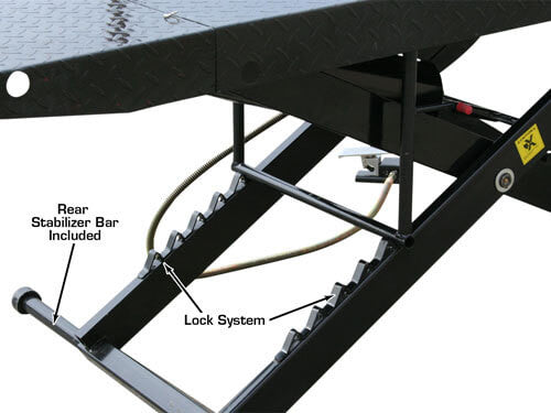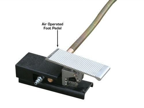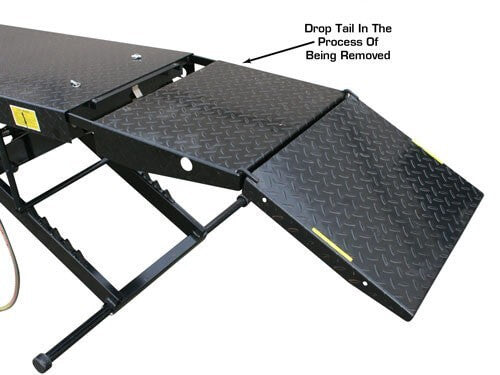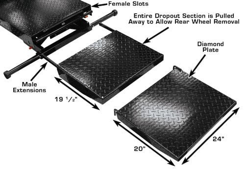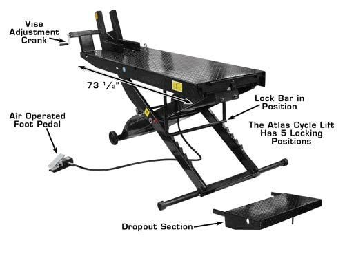 The Atlas Cyclelift has one of the industry's longest (standard) platforms to accommodate extra long motorcycles. The motorcycle lift has a heavy gauge (diamond plated) platform length of 93 inches and an additional 20 inch removable approach ramp. The Atlas Cyclelift is air operated and requires between 90-100 PSI to operate. The Cyclelift is the perfect addition to any service department of professional motorcycle dealers or is a great motorcycle lift for the person who wants to work on his personal bike in their own garage. This is a complete motorcycle lift that includes an adjustable front (padded) wheel vise and a heavy duty air operated foot valve for easy raising and lowering. The stabilizing bar is included at no extra charge. This bar provides greater stability for the raised platform by increasing the “footprint” of the lift. Many companies do not include this very important stabilizing bar in their “lift package”. The Atlas Cyclelift motorcycle lift comes standard with a 19 1/2" removable rear section. This 19 1/2" section can be easily removed so that a rear tire can be “dropped straight down” from the rear axle. Since the entire platform width is removed, any sized rim can be lowered from the axle. For those customers looking for more width to pick up ATV's, UTV's, Golf Carts, and other wider vehicles the Atlas Cyclelift can be equipped with the Atlas Cyclelift Side Extension Kit to increase the width up to 4 feet.