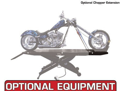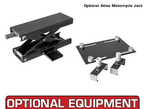 The Atlas Cyclelift XLT has all the great features of our Atlas Cyclelift with the addition of a side extension kit. The lift has one of the industry's longest (standard) platforms in the industry, 93 inches long. Installing the extension kit on the Cyclelift extends the platform to 48" wide and allows the user to raise up ATV's, UTV's, Golf Carts, and Lawnmowers. The Atlas Cyclelift XLT is air operated and requires between 90-100 PSI to operate. The Cyclelift XLT is the perfect addition to any service department of professional motorcycle dealers or small equipment service shops. The Cyclelift XLT is also great for the Mr. Homeowner who wants to work on their own personal bike, ATV, lawnmower or other similar vehicles at home. This is a complete ATV lift that includes the side extension kit consisting of two 12" side extensions, two 12" ramp extensions, and a wheeled dolly. The Cyclelift XLT also includes standard the stabilizing bar, this bar provides greater stability for the raised platform by increasing the “footprint” of the lift. Many companies do not include this very important stabilizing bar in their “lift package”. Other popular features include the padded front wheel vise, 19 1/2" long rear removable plate, and a wheeled dolly to assist in moving the lift.