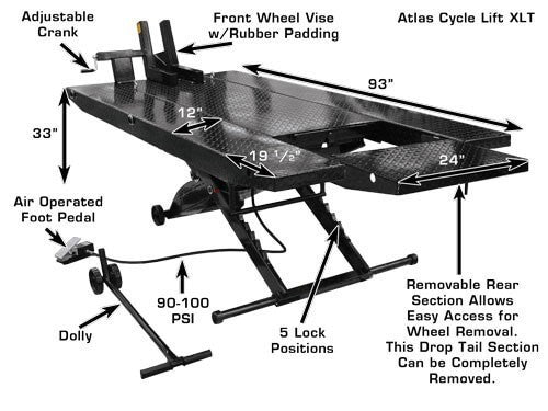 The Atlas® Cyclelift XLT is air operated and requires between 90-100 PSI to operate. The Cyclelift XLT is the perfect addition to any service department of professional motorcycle dealers or small equipment service shops. The Cyclelift XLT is also great for the Mr Homeowner who wants to work on their own personal bike, ATV, lawnmower or other similar vehicles at home.