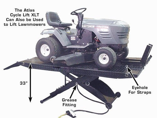 The Atlas® Cyclelift XLT has all the great features of our Atlas® Cyclelift with the addition of a side extension kit. The lift has one of the industry's longest (standard) platforms in the industry, 93 inches long. Installing the extension kit on the Cyclelift extends the platform to 48" wide and allows the user to raise up ATV's, UTV's, Golf Carts, and Lawnmowers.