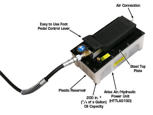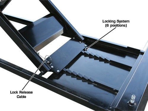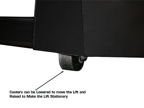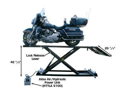 The Atlas HI-RISE 1500 is one of the industry's most popular motorcycle and ATV lifts. This lift has a manufacturer rating of 1650 lbs. but we rate the lift at 1500 lbs., because we always under rate our weight capacities. The HI-RISE 1500 is powered by a high quality air/hydraulic pump which is included. This lift requires 100 PSI from an outside air source (not included). The Atlas HI-RISE 1500 has an extra tall lift height of 43 inches. This increased lifting height makes it easier to work on vehicles while the operator is standing. This lift comes standard with a chopper extension making the center table 100 3/4 inches long and able to accept some of the longest choppers. The lift also comes standard with a side extension kit, with an overall table width of 51 1/8 inches, and is able to easily lift ATV's, UTV's, Golf Carts, Lawnmowers and other four wheel vehicles. The HI-RISE 1500 is the perfect addition to any service department of professional motorcycle dealers or equipment service shop or even a homeowner who wants to work on bikes or ATV's in their own garage. This is a complete motorcycle/ATV lift and besides the features above includes an adjustable front (padded) wheel vise and a removable rear drop out section. The Atlas HI-RISE 1500 has a wide solid base for greater stability and which incorporates screw casters that can be lowered to move the lift and retracted when working.