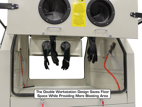 The Atlas® SBC1200 sandblast cabinet takes many of the already great features of the Atlas® SBC990 blasting cabinet and doubles them. The SBC1200 sandblast cabinet has two, front and rear, extra large top open loading doors and features an expanded extra large work area. Both doors have viewing windows, 24" gloves, and a blasting gun creating a floor space saving double workstation design.
