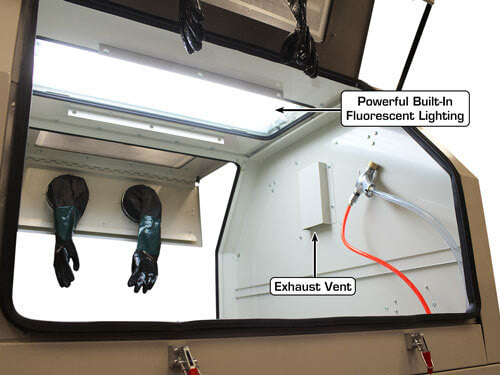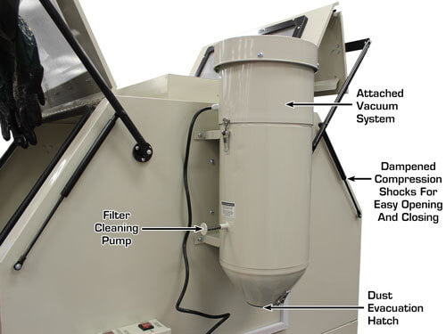 The Atlas® SBC1200 uses a side-mounted powerful vacuum system to keep the work area free of "floating" rust and used media. After the glass bead contacts the surface to be cleaned, a portion of the bead is "destroyed" becomes almost weightless. The vacuum system removes the "floating" rust particles and the "used up" glass beads.