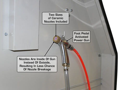 The Atlas® SBC1200 utilizes two independent foot pedal valves that control the flow of abrasives from the dual blasting guns. The foot pedal design allows the operator to concentrate on the work to be done inside the cabinet rather than hold the trigger of a gun. The heavy duty blasting guns use ceramic nozzles (easily replaceable) with a variety of hole sizes to provide the most effective blasting area.