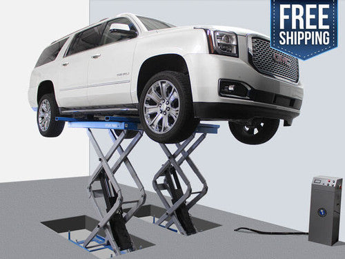 The Atlas FM9SL 9,000 lb. flush mounted scissor lift is the perfect choice for those service facilities that need to maximize the number of vehicle lifts per service area square foot. If you like the “clean floor look” for your service department (no above ground lifts), then the Atlas FM9SL flush mounted scissor lift offers the perfect alternative. Unlike “old school in-ground” lifts, the flush mounted lift requires minimal excavation and the electric/hydraulic power unit is easily accessed during periodic maintenance. The flush mounted platforms offer no “above ground” obstruction and the platforms can be “driven over” from any direction so that a vehicle may be properly positioned in the tightest of spaces. The Atlas FM9SL has both front and rear platform extensions that can be used when lifting a long wheel base pick-up truck. As with any scissor lift that is completely open (no cross support bar in the front or rear to keep the platforms level), the operator must make sure that the vehicle's frame is positioned at least 6 inches from the inside of the platform. If too much weight is positioned near the edges of the platform (closer than 6 inches from the inside edges), the platforms may become “pigeon toed” and damage may occur. We sell the Atlas scissor lift support bar kit to disperse the narrow frame weight over the entire platform lifting surface