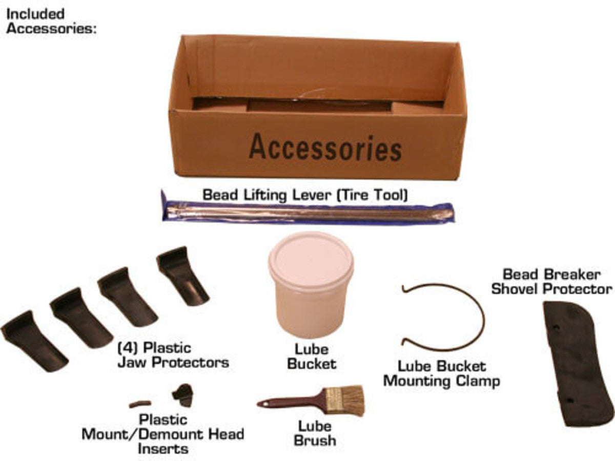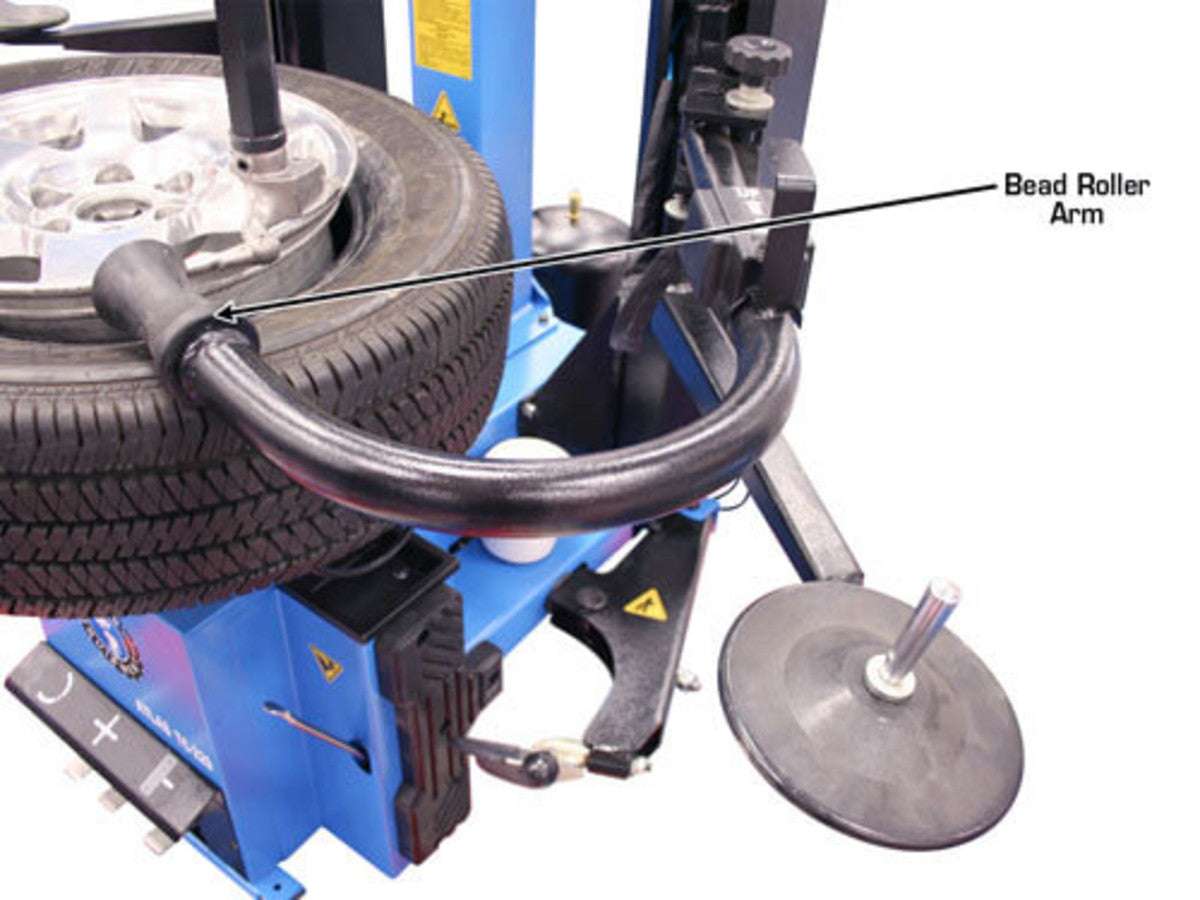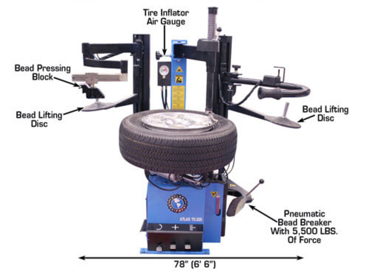 The Atlas TC229DAA rim clamp, swing arm tire changer is the perfect machine for homeowners, a small commercial garage or an ATV/Motorcycle dealer. This version of the TC229 comes with the Atlas DAA-SA dual assist arm package, made up of a left hand mounted arm with a pressing block and pressing/lifting disk and a right hand mounted arm with a pressing/lifting disk and bead roller. The dual assist arms are a necessary tool if you will be changing a high number of stiff sidewall, low profile, runflat style tires. The DAA acts as an extra set of hands saving a single user time and effort. The TC229 also features the added built in “Beadblaster” system. The “Beadblaster” system helps inflate stiff sidewall or other “hard to inflate” tires. If you are plan on changing larger pickup truck (1 ton), large SUV, or agricultural tires (either now or in the future), you may want to consider the Atlas TC289 tire changer. The Atlas wheel clamp tire changers are designed to change the tires on both high priced alloy wheels and steel wheels without damaging the rim or the tire. The powerful bead breaker located on the side of the machine is designed to break even the most stubborn and rusted beads without damage to the rim. The turntable jaws (which can be covered with plastic covers) hold the rim securely without damaging the surface of the rim. These jaws can be moved to three different positions along the slide of the turntable to either increase or decrease the clamping range, and to handle the widest variety of tires. The Atlas TC229DAA requires some assembly after purchase.