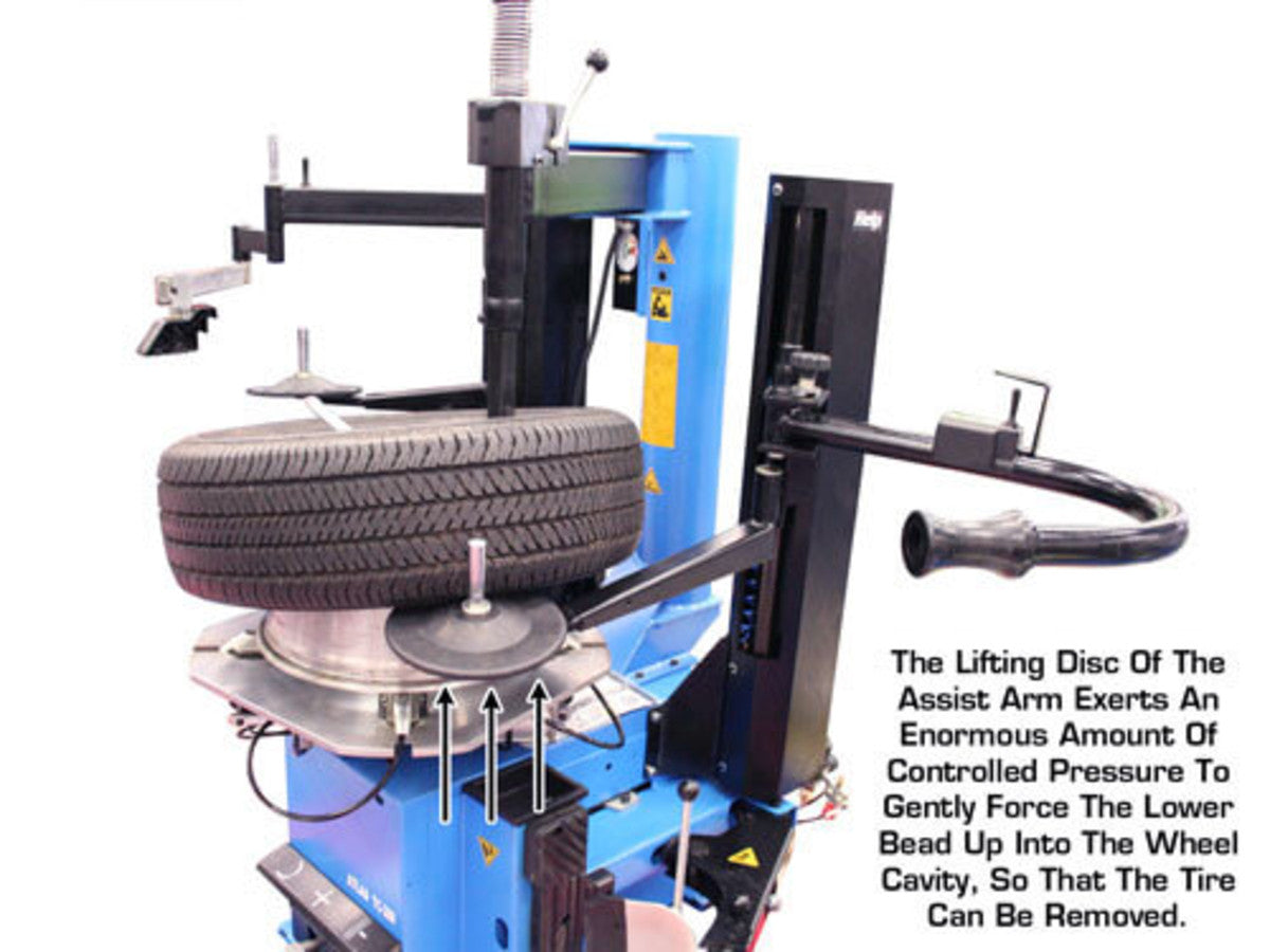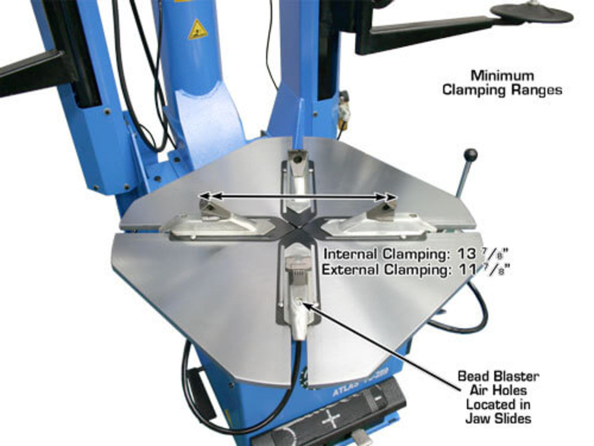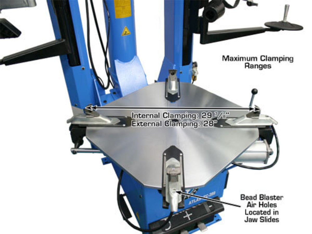 The Atlas® TC289DAA rim clamp, swing arm tire changer is the perfect machine for most general automotive serivce departments, medium sized tire stores and for farm use. This version of the TC289 comes with the Atlas® DAA-SA dual assist arm package, made up of a left hand mounted arm with a pressing block and pressing/lifting disk and a right hand mounted arm with a pressing/lifting disk and bead roller. The dual assist arms are a necessary tool if you will be changing a high number of stiff sidewall, low profile, runflat style tires. The DAA acts as an extra set of hands saving a single user time and effort.The Atlas® TC289DAA machine features the biggest turntable and most clearance to handle the biggest diameter tires, and is perfect for changing the tires on large SUV�s and one ton trucks. The TC289 features a built in “Beadblaster” system. The “Beadblaster” system helps inflate stiff sidewall or other “hard to inflate” tires.The Atlas® wheel clamp tire changers are designed to change the tires on both high priced alloy wheels and steel wheels without damaging the rim or the tire. The Atlas® TC289 has a powerful ADJUSTABLE bead breaker located on the side of the machine which is designed to break even the most stubborn and rusted beads without damage to the rim. The turntable jaws (which can be covered with plastic covers) hold the rim securely without damaging the surface of the rim. These jaws can be moved to three different positions along the slide of the turntable to either increase or decrease the clamping range, and to handle the widest variety of tires.The Atlas® TC289DAA requires some assembly after purchase.