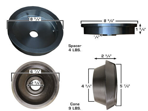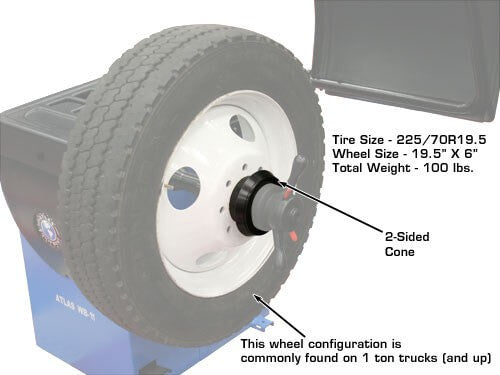 The Atlas® large truck adapter set is needed to properly mount wheels with larger than normal center holes. The standard cone adapter set (included with all Atlas® wheel balancers) will accommodate wheels with center holes of up to about 4 inches in diameter. Many steel wheels found on and 1 ton pick up trucks have larger center holes.