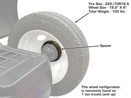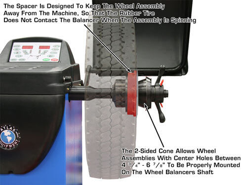 The Atlas® large truck adapter set comes complete with a large steel cone, and a spacer. Most larger pick up wheels are a BUDD design wheel which means that the majority of the tire is positioned toward the inside of the rims. The spacer included with the Atlas® large truck adapter kit is used to “push” the wheel away from the machine, so that the rubber tire does not contact the balancer when the assembly is spinning.