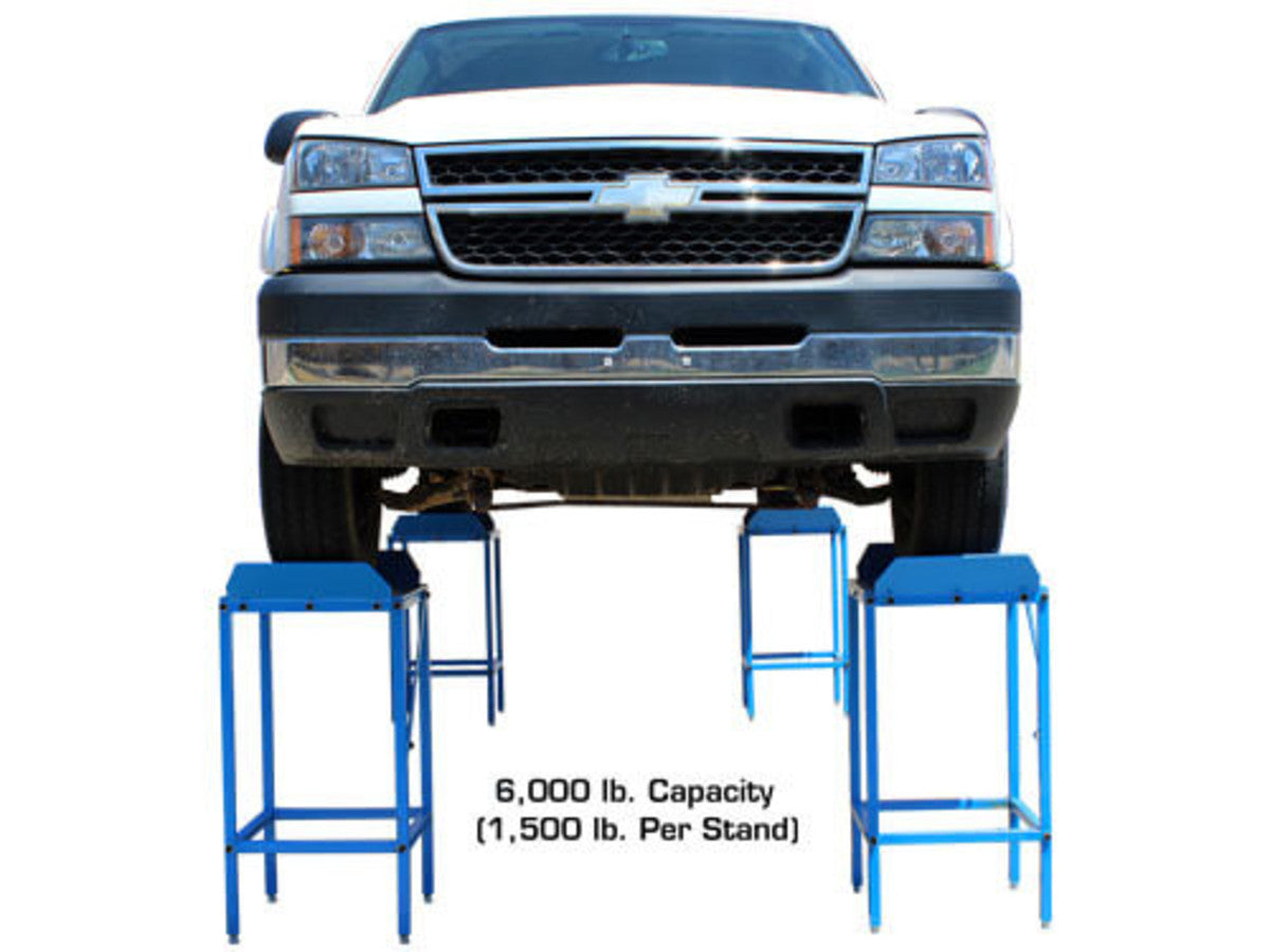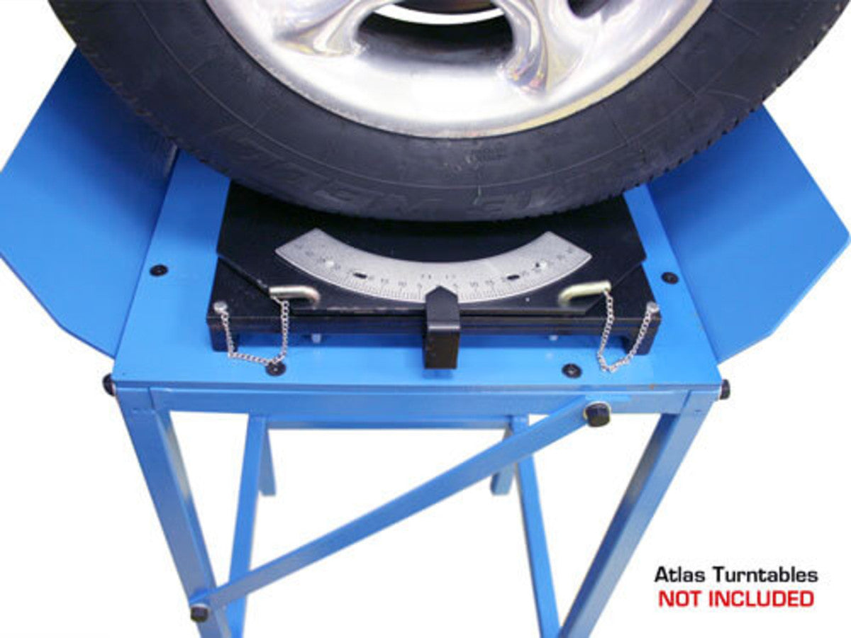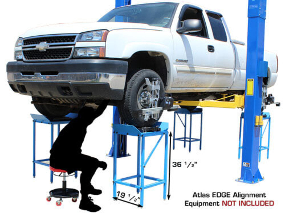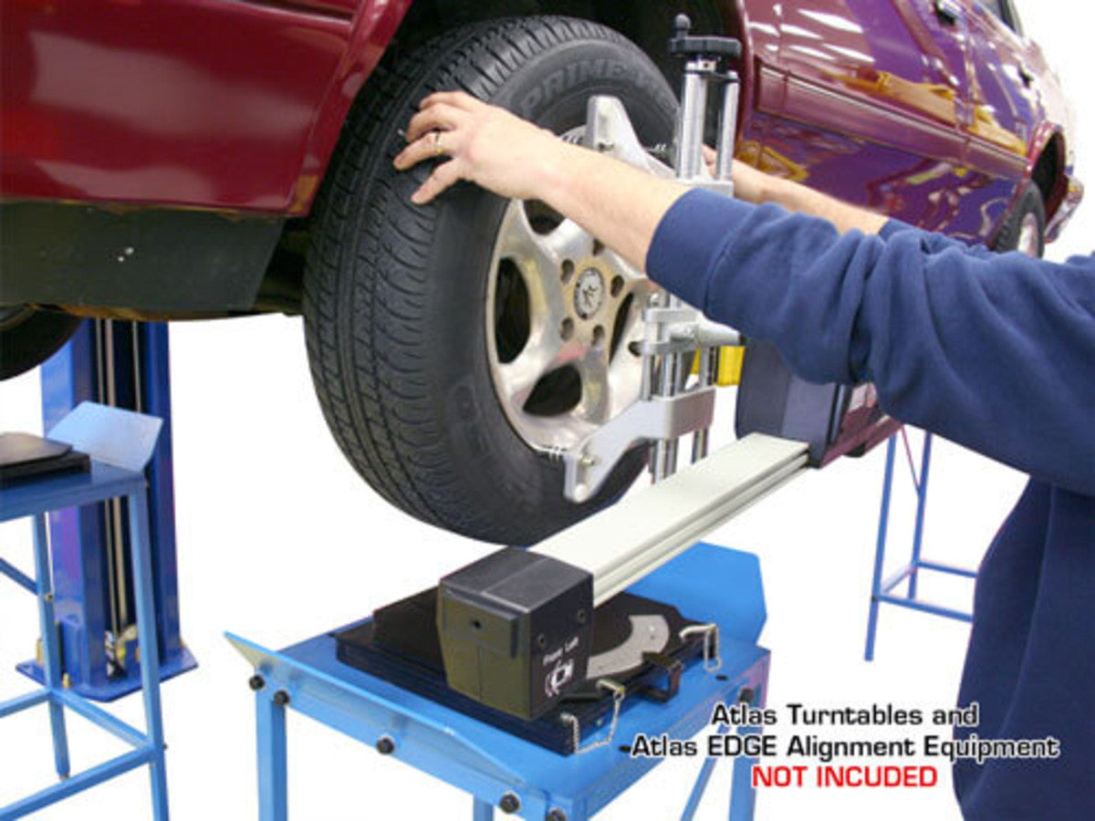 The Atlas® Wheel Stands are the perfect choice for those smaller shops who want the advantages of a four post lift but have only limited floor space. The set of Atlas® Wheels Stands can support up to 6,000 lbs. and, because they are taller than most other stands, are the perfect height for hanging wheel alignment sensors. Many shops do not have room for a dedicated four post alignment lift. These shops may have only two post lifts or midrise lifts in their existing facility. The Atlas® Wheel Stands can be adjusted (leveled) so that they can be used for wheel alignment. Simply place a turntable on each wheel stand and your two post lift has been transformed into a four post alignment lift. Use the arms of your two post lift (or mid-rise lift) to raise the vehicle to perform lateral run-out compensation for your sensors or to make adjustments on the front or rear ends. The Atlas® Wheel Stands are also perfect for undercar service including exhaust and suspension adjustments and installations.The Atlas® Wheel Stands are the perfect choice for those two post lift owners who also want the many advantages offered by a four post lift, but just do not have the extra shop space.